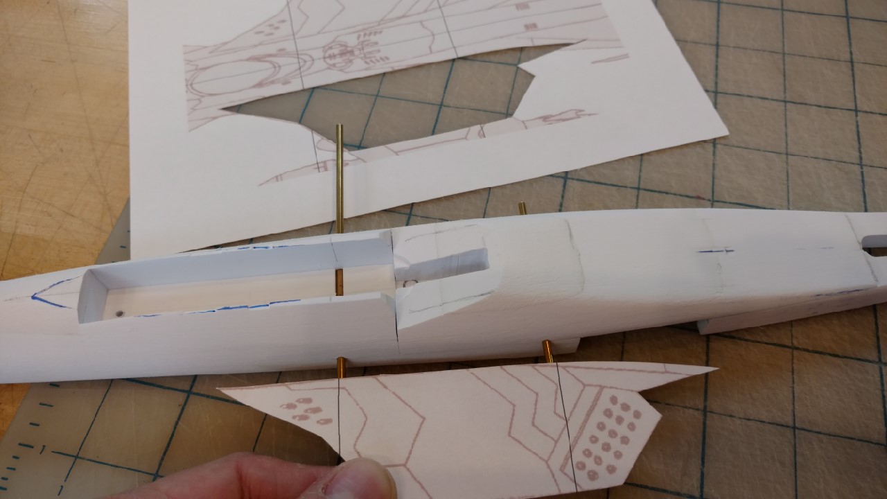 Wing is part of the fuselage. The various slots in the fuselage sandwich are for these brass pins that will locate and support the wing. Here is a paper template of the wing to get this part rolling along. No detail gets added until all the basic structures are in place.