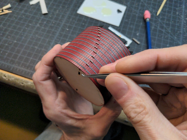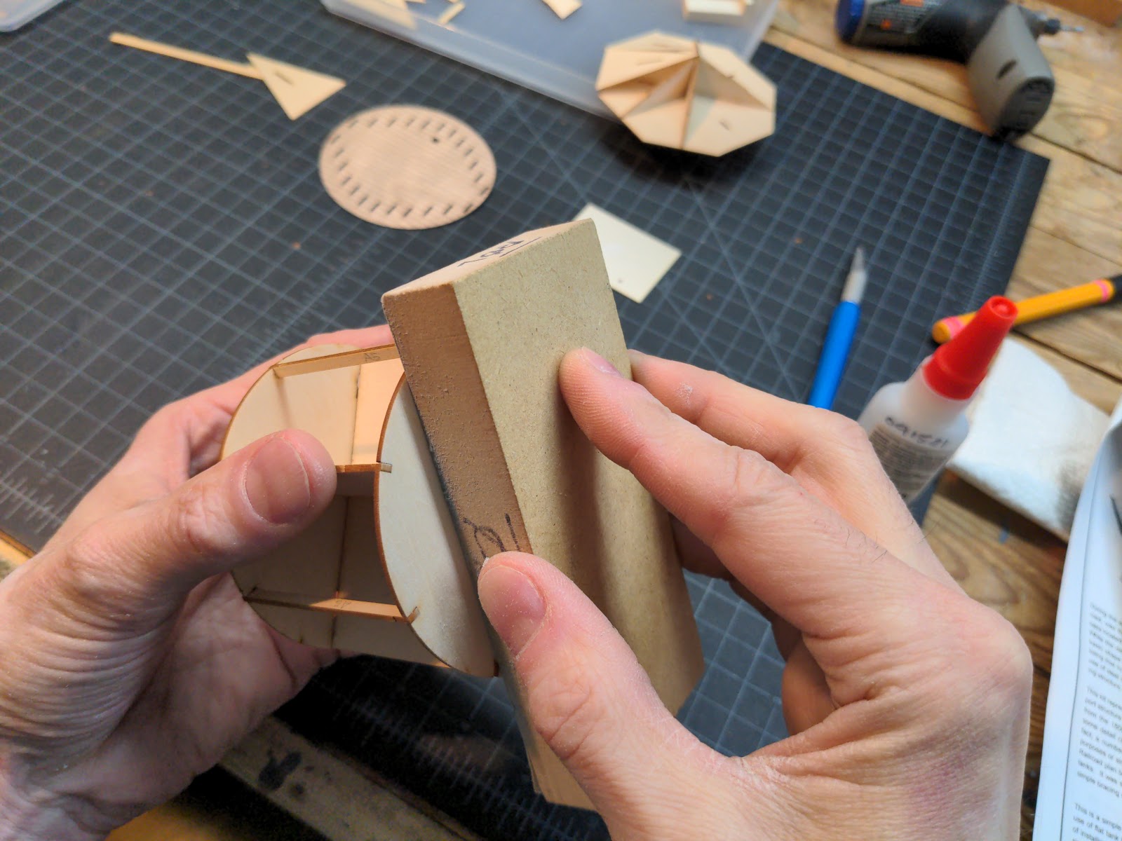 The tank exterior is then wrapped around the support structure. This turned out to be a bit harder than I thought, I would have added more structure underneath to keep the thin plywood from bowing inwards and allow for more surface for gluing.